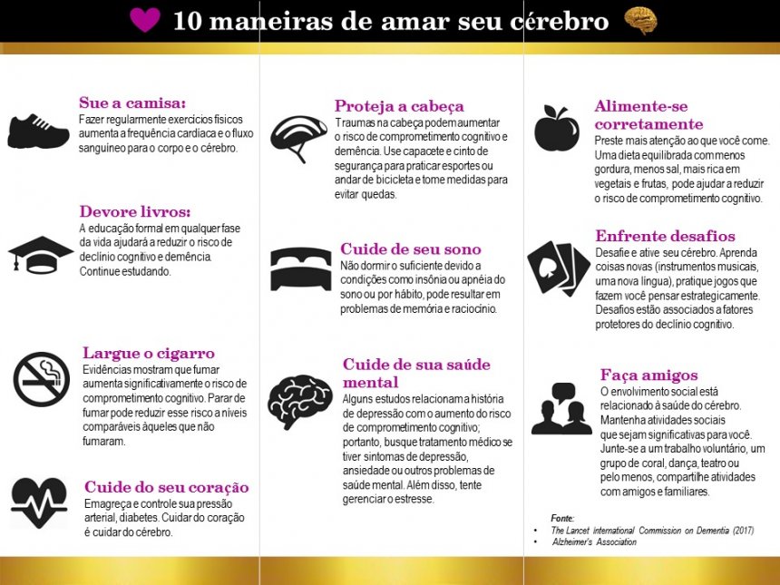 Desafie e ative seu cérebro. Aprenda coisas novas (instrumentos musicais, uma nova língua), pratique jogos que fazem você pensar estrategicamente. Desafios estão associados a fatores protetores de declínio cognitivo.