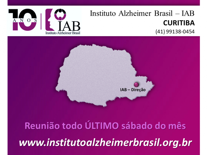 Você e sua família estão convidados a participar da REUNIÃO MENSAL com grupo de apoio, que o Instituto Alzheimer Brasil - IAB (CURITIBA) realiza mensalmente.