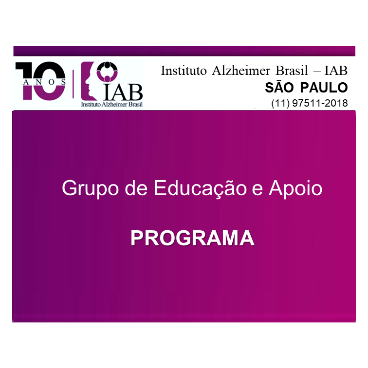 Os Grupos de Educação e Apoio do IAB (PRESENCIAIS), direcionados aos cuidadores familiares de pessoas com Doença de Alzheimer e outras formas de demência, fornecem oportunidades de adquirir muitos conhecimentos relacionados a doença, aos cuidados e a forma de como lidar com os comportamentos alterados que possam surgir ao longo do processo da doença. Além disso, irá conhecer outras pessoas em situações semelhantes às suas, trocar experiências com as mesmas e com profissionais da área, compartilhar histórias, acessar conselhos práticos, em ambiente descontraído e solidário.