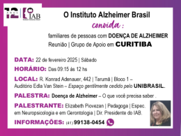 O Instituto Alzheimer Brasil - IAB convida familiares de pessoas com Doença de Alzheimer e outras formas de demência para REUNIÃO E GRUPO DE APOIO: