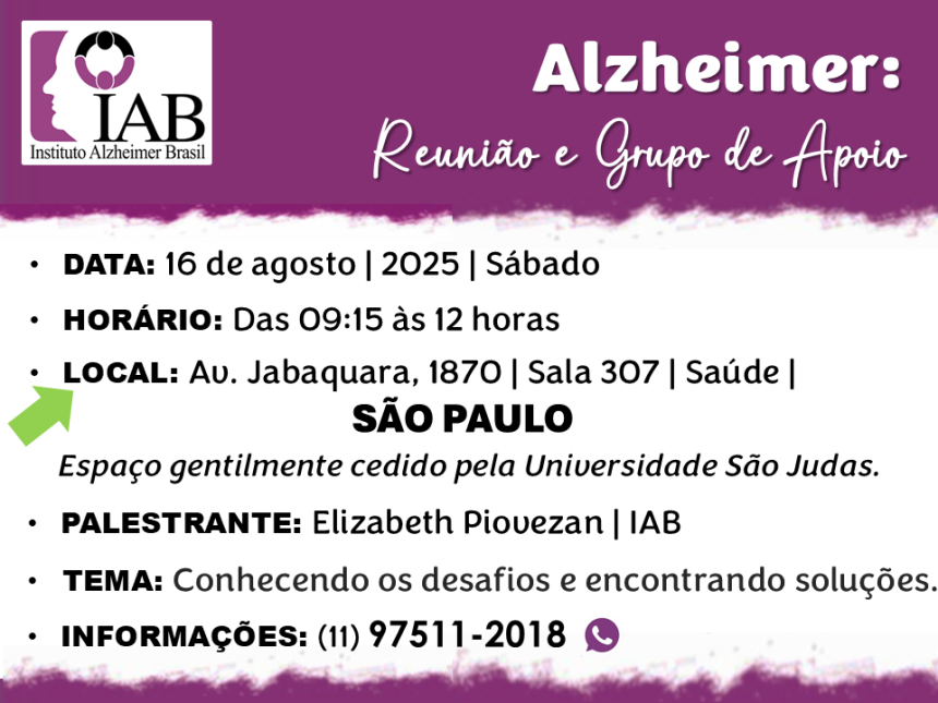 O Instituto Alzheimer Brasil CONVIDA os familiares de pessoas com Doença de Alzheimer de SÃO PAULO, para a reunião neste próximo sábado