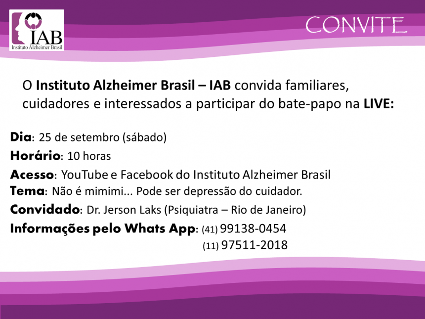 O Instituto Alzheimer Brasil – IAB convida familiares, cuidadores e interessados a participar do bate-papo na LIVE: