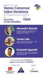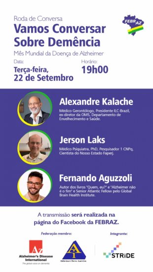 A FEBRAZ - Federação Brasileira das Associações de Alzheimer convida a todos para o bate papo: Vamos conversar sobre demência, tema da Campanha do Mês Mundial de Conscientização da Doença de Alzheimer que diversas Associações do mundo adotaram, para falar a mesma linguagem e demonstrar os mesmos propósitos com relação a demência.